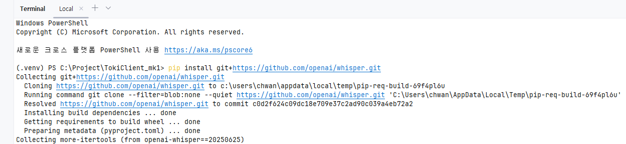 pip install whisper로 할 경우 다른 비공식 라이브러리가 깔릴 수 있어 git을 이용한 우회적 방법을 사용했다.