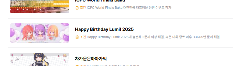 solved.ac 프로필배경이 어떤게 추가가 되었나 둘러보다가, 옛날같았으면 대회에 참여해야 주던 배경을 이제는 문제 풀이로도 받을 수 있는 것들이 생겼다는 것을 보게 되었습니다. 기왕 봤는데... 해봐야겠죠?