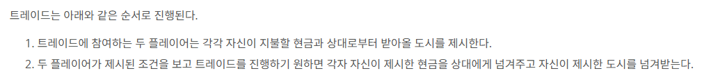 거래 전 후로 A(나)와 B(상대)의 도시 보유 상태와 담보 여부 및 현금 계산만 해주면 됩니다. 도시가 40개씩이나 되어서 복잡해보일 수도 있는데 속성이 도시, 담보, 현금 3가지이기에 간단하게 계산이 가능합니다. 변수가 많아서 조금 헷갈릴 수는 있습니다.