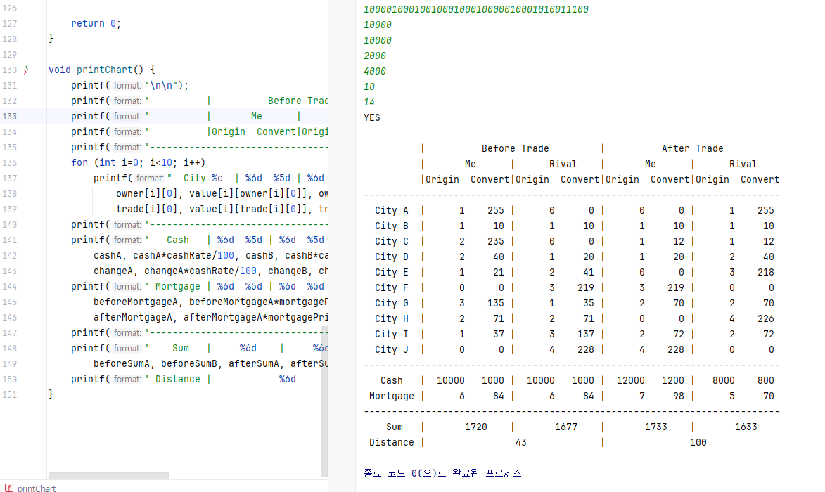 앞서 owner 배열과 trade 배열의 각각 0열과 5열을 A와 B의 보유 도시 개수를 저장하기 위해 6열짜리로 선언했다고 언급했었습니다. 그에 맞게 각 구역 별 A와 B의 보유 도시 개수를 계산해줍니다. owner 배열이 거래 이전 원래 소유자, trade 배열이 거래 이후 변경된 소유 상태를 저장한 배열입니다.각 배열 0열과 5열은 0부터 3사이의 값을 갖게 됩니다.