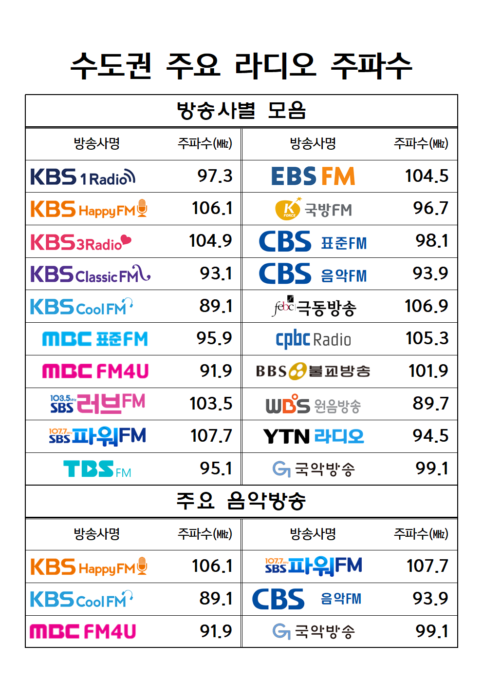 언젠가 한번 만들어야지 만들어야지 하고 미루다가 이제서야 만들어보는, 수도권 주요 라디오 주파수입니다. 제가수도권 인근에 있다보니 수도권 기준이 되었는데.. 강원권이나 충청권, 전라권, 경상권 등등 필요하면 수정하여 쓰셔도 무방합니다.