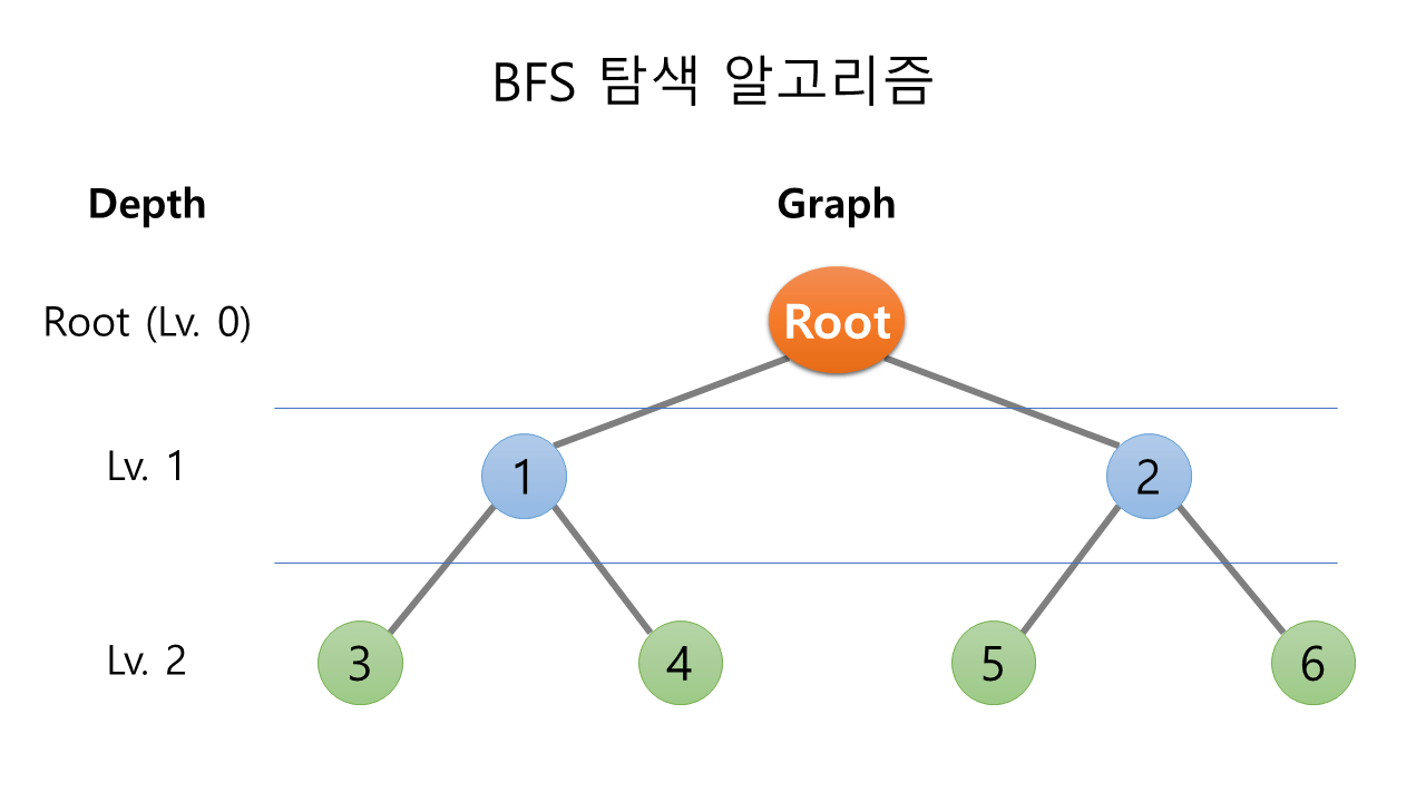 BFS 하면 가장 많이 보이는 그림입니다. Root는 탐색을 시작하는 지점이며 레벨 0으로 간주하겠습니다. BFS의 동작은 해당 레벨의 노드를 모두 탐색하면 다음 레벨의 노드를 탐색합니다. 그림에서 보시다시피 레벨 1의 노드 두 개 (1, 2번)을 모두 탐색한 후에는 레벨 2로 넘어가서 탐색을 계속합니다.
